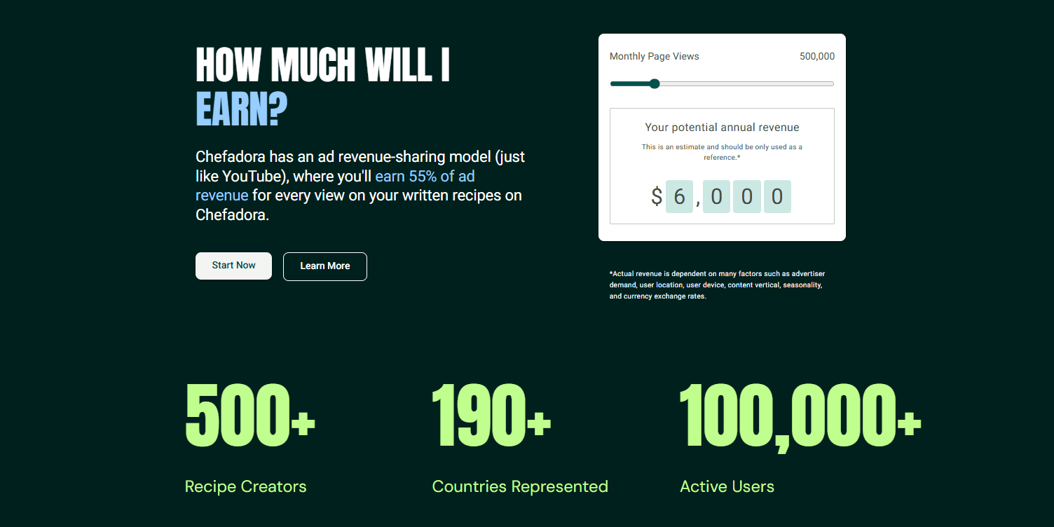 Think of it like YouTube, but for written recipes. YouTube pays creators 55% of the ad revenue their videos generate. Chefadora pays you 55% of ad revenue every time someone reads your recipe.