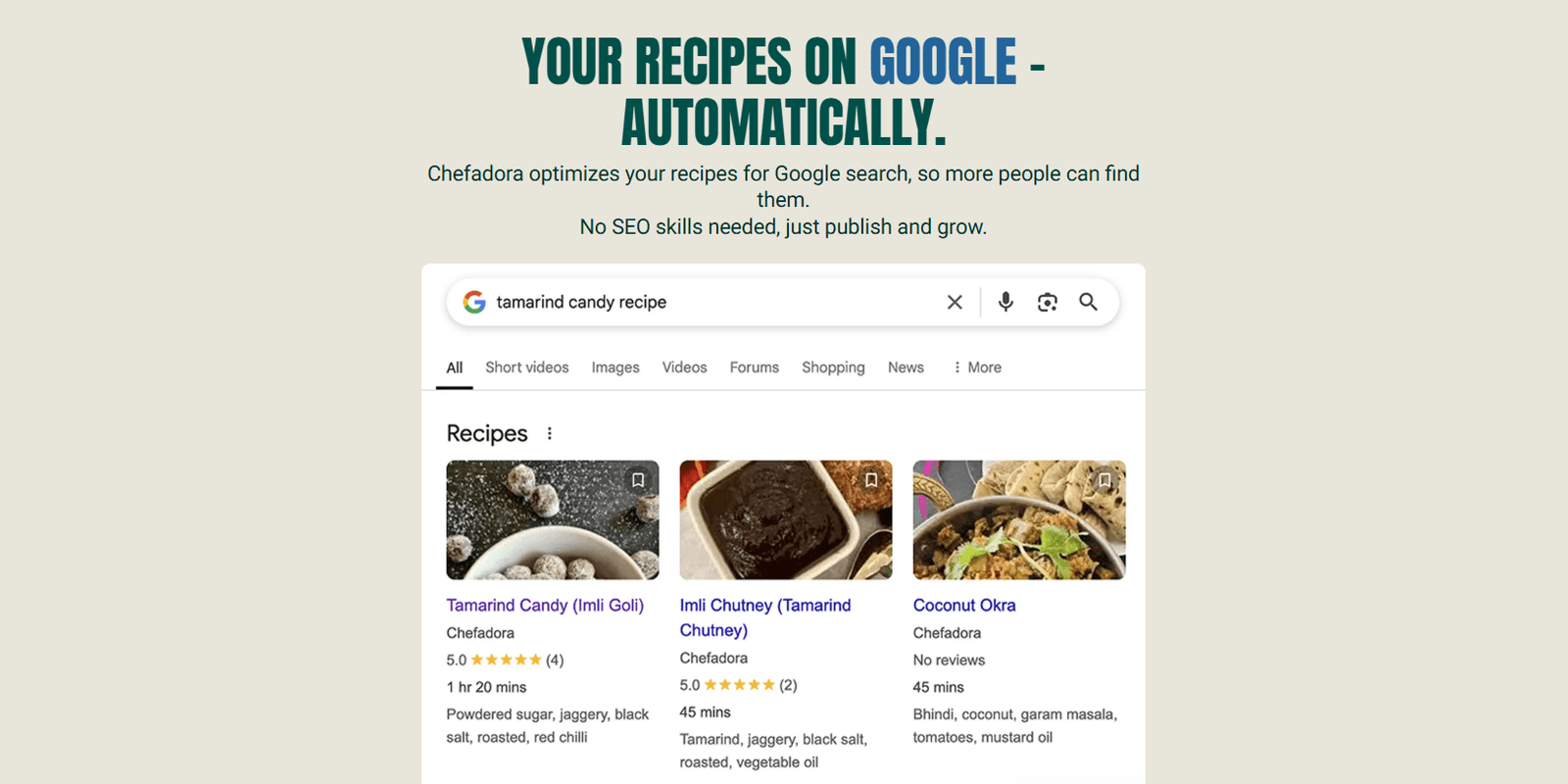 A3. Yes. Every recipe you publish on Chefadora gets indexed by Google. Someone searches for a dish you make, yours can show up. No ads, no SEO knowledge, nothing extra. Just publish and Chefadora does the rest.