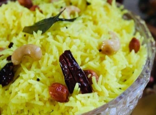Lemon Rice (Chitranna): A traditional, zesty South Indian dish made with fragrant rice infused with fresh lemon juice, turmeric, and a touch of green chilies for a kick. Garnished with crunchy peanuts and aromatic curry leaves, it’s a vibrant, flavorful option that’s as nutritious as it is delicious.