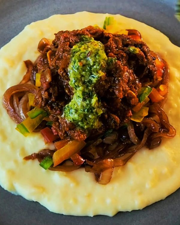 A delicious Kenyan-inspired dish featuring braised beef cubes with caramelized balsamic onions, served with creamy Paris mash potatoes and topped with a vibrant green pesto.